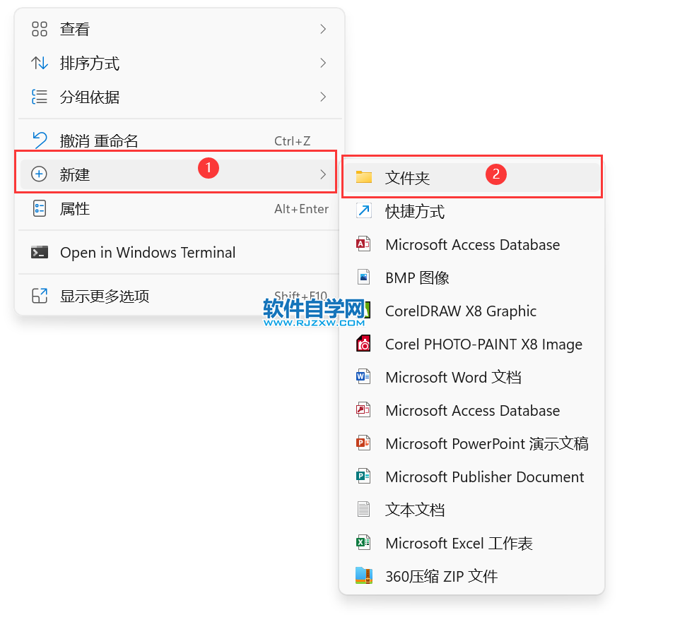 第4步、右击空白处,弹出对话框,点击新建。再点击文件夹。