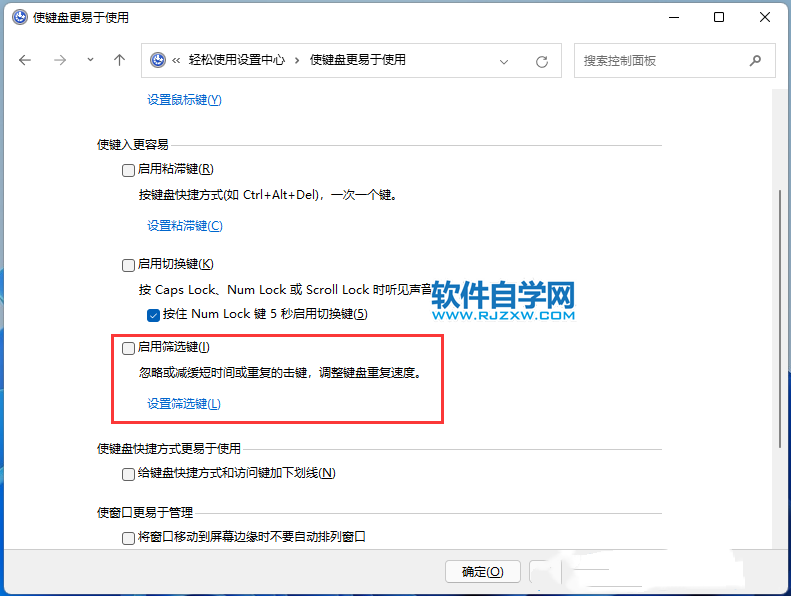 4、使键盘更易于使用窗口,取消勾选启用筛选键(忽略或减缓短时间或重复的击键,调整键盘重复速度),然后点击应用确定即可。