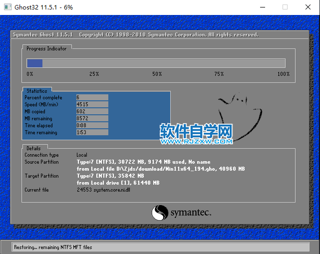 第7步、系统备份还原完成后,会开始系统自动安装,安装完成自动重启后即可进入系统。