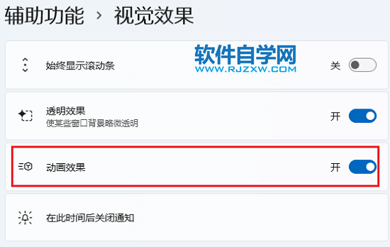 4、最后将【动画效果】后面的【开关】关闭即可。