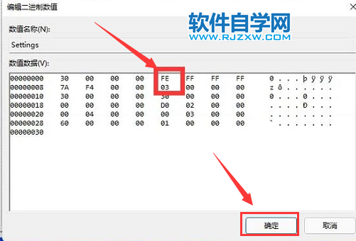 4、在弹出的编辑二进制数值界面中,将FE数值修改为01,并点击确定保存即可。