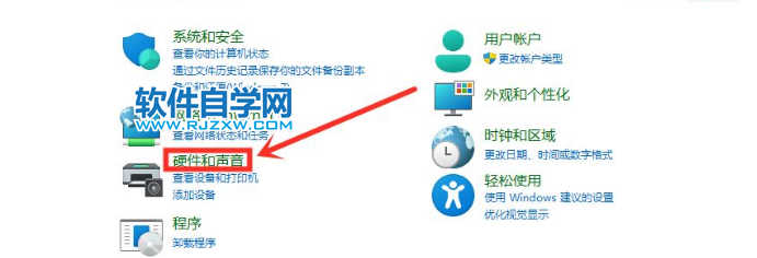 2、点击【硬件和声音】。