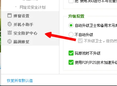 3、然后在打开的页面中,左侧找到安全防护中心的按钮。