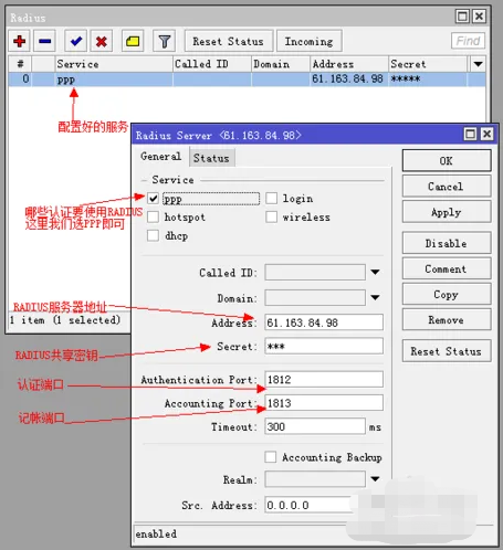 2、在“Address”选项中填写计费认证服务器的IP地址,在“Secret”选项中填写共享密钥。