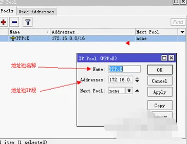 4、配置PPPoE服务:配置通讯端口,打开“Incoming”选项,通常配置为3799。配置地址池,进入IP-POOL,根据需要进行配置,并确保所选地址池段的IP能够通过ROS上网。