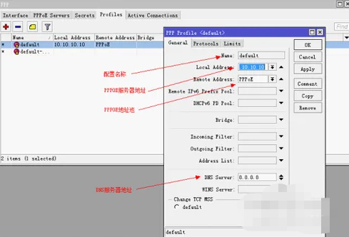 5、选择PPP下的Profiles,点击添加,配置PPPOE服务器地址和DNS地址。必填项目包括:Local Address、Remote address和DNS server。