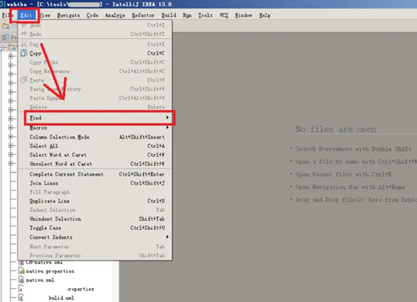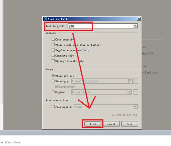 4、点击"Find" -> "Find in Path",就会弹出一个全局搜索条件输入对话框。
