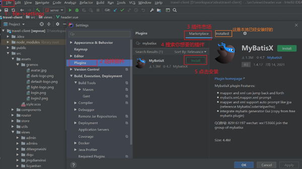 Intellij Idea几乎是每个java程序员开发必备的开发工具,除了idea自身功能强大很好用外,还有一个重要的原因就是其插件库非常丰富,而且安装也非常简单。 intellij idea添加插件的方法:1、打开file->settings菜单 2、点击Plugins插件列表 3、点击MarketPlace插件市场,这里可以看到很多插件信息 4、在搜索框搜索自己想要的插件名称 5、选择你要安装的插件,点击install进行安装
