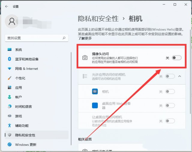 5、最后找到【摄像头访问】选项,然后将其右侧的【开关按钮】打开即可。