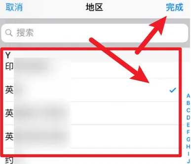 3、在"地区"界面根据需求选择并点击右上方的"完成"。