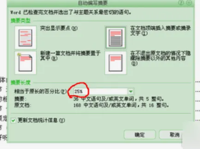 6、在弹出的"自动编写摘要"对话框中,可以更改摘要的百分比和选择摘要类型,如将摘要设置在文档顶部、突出显示要点或生成新的文档摘要等。