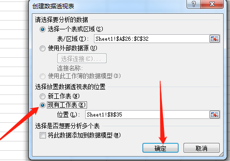 3、选择插入"数据透视表"到现有工作表,点击“确定”。