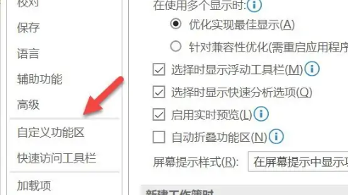 2、在选项界面中,点击“自定义功能区”。