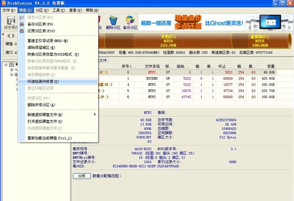 小伙伴们知道diskgenius怎么修复硬盘坏道吗?今天小编就来讲解diskgenius修复硬盘坏道的方法,感兴趣的快跟小编一起来看看吧,希望能够帮助到大家呢。 diskgenius修复坏道介绍1、打开DiskGenius软件,选择系统分区,点击菜单栏中的“硬盘”选项,找到“坏道检测与修复”。