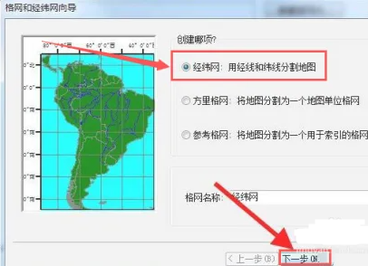 3、在跳转界面将“经纬网”勾选上,点击“下一步”按钮。