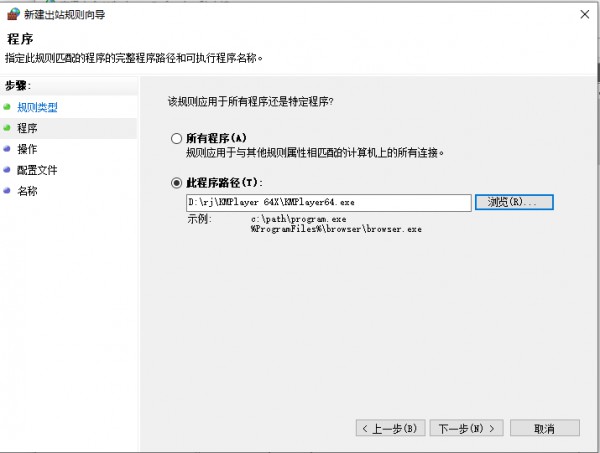 5、将KMPlayer的安装路径复制到“此程序路径中”,之后一直点击“下一步”。