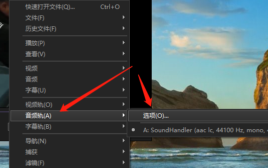 2、鼠标右键播放器界面,选找到“音频轨”--“选项”。