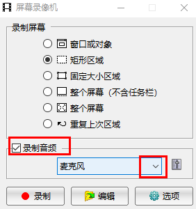2、在“屏幕录像机”界面,找到下方“录制音频”的下拉按钮点击。