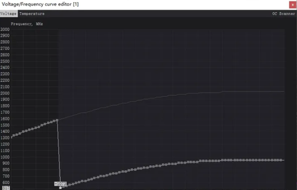 2、在Curve Editor中找到电压-频率曲线,按住SHIFT键选择800mV之后的所有点,并将它们移动到最下面。