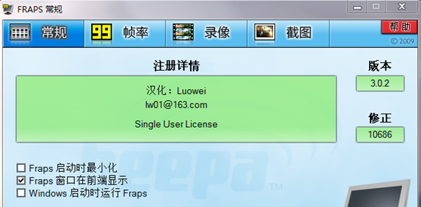 2、确认已成功注册Fraps版本,如果使用破译版,请确保破译有效。