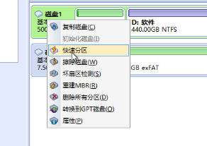 2、右键点击目标硬盘,选择"快速分区"。