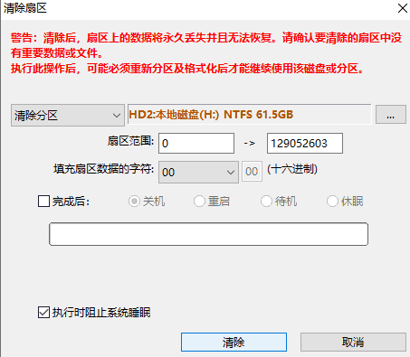 在这个对话框中,您可以更改要清除的分区或磁盘,指定要清除的扇区范围(如果选择清除分区扇区,则扇区号是相对于分区起始位置的扇区号),还可以指定用于填充的字符。 3、单击"清除"按钮执行扇区清除操作。软件将显示以下警告信息: