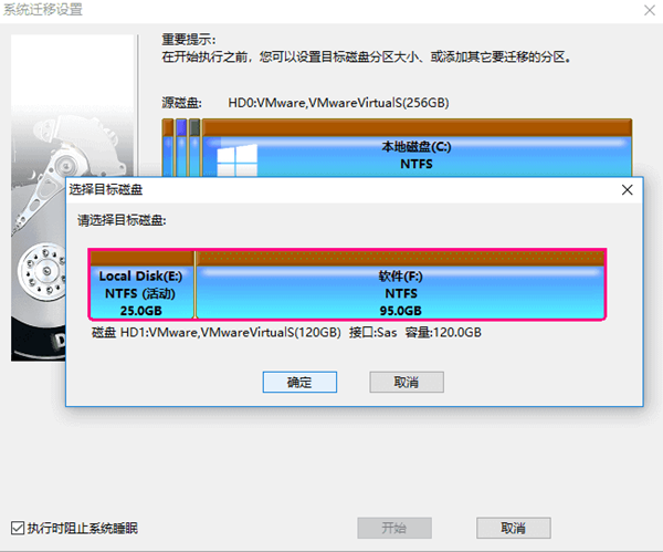 2、选择迁移系统的目标盘,然后点击"确定"按钮。目标磁盘可以小于源磁盘,但是目标磁盘容量需大于源磁盘的已用数据总量。