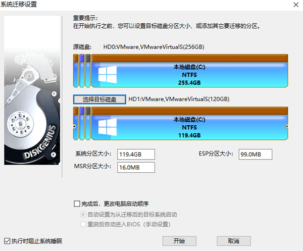 3、对于支持UEFI的电脑,还可以直接指定系统迁移完成后,是否更改系统的启动项。点击"开始"按钮,准备进行迁移。