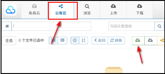 2、在进入界面点击顶部“公有云”,然后点击右下方“向上箭头”。