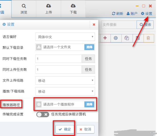 5、接着点击右上角“设置”,设置“播放器路径”后,点击“确定”。