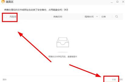 2、在“隔离区”界面找到要恢复的文件,选择,点击右下角“恢复”按钮。