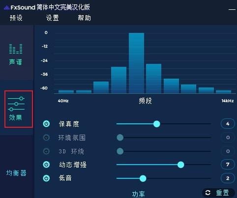 3、在“效果”页面,可以自定义保真度、动态增强、低音等,