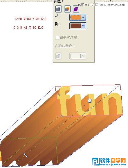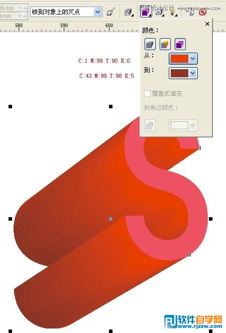 然后呢、就是绘制大"S"、因为这个比其他的字母都要大、所以要分开来绘制、过程也是一样、用立体化工具、颜色的CMYK值都在图片里面
