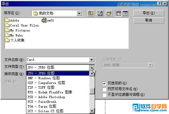 图20 五、输出文件 你此时所做的文件是CDR格式的文件,只能在CorelDRAW中打开。要想在网上能够用浏览器浏览,你得重新生成浏览器能够打开的文件格式,例如JPG等格式。 (1)选中整张图,并选择“文件”菜单下面的“导出”。 (2)在导出对话框中输入导出文件名称,并在文件类型下拉列表中选择“JPG-JPEG位图”,点出“导出”按钮,如图21.