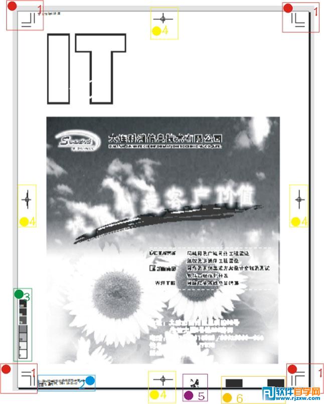 1) 裁切线出血标记;2) 文件信息;3) 印刷网点标记;4) 印刷对版标记;5) 印刷分色版放射状标记;6) 印刷版颜色标记。