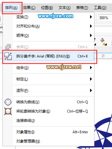 第十二步:选中文字,点击排列菜单,此教程由平面自学网首发,拆分美术字。