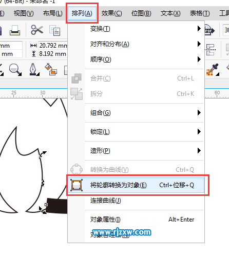 第6步:选中加粗后的曲线,点击排列菜单上面的将轮廓转换为对象。