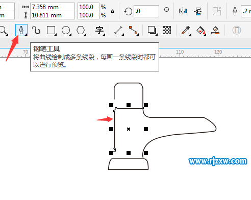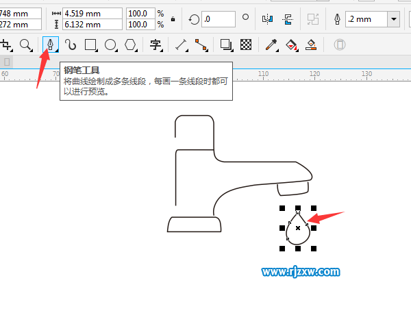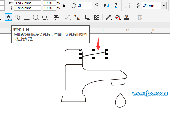 第1步、打开CDRX8软件,使用钢笔工具绘制水龙头外形出来。效果如下: