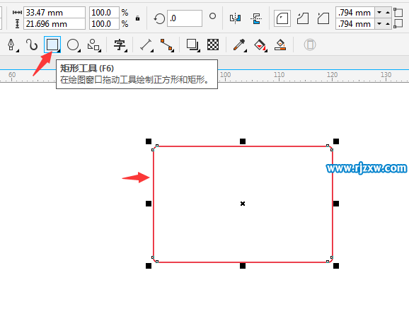 第1步、打开CDR软件,按F6绘制一个矩形出来,再用形状工具进么倒圆角处理。