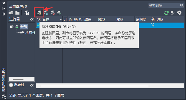 2、然后就会弹出【CAD2024图层对话框】。点击【新建图层】图标。