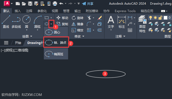 1、打开CAD2024软件,点击椭圆工具里面的轴,端点,如下图: