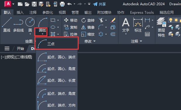 3、然后点击圆弧工具,点击三点圆弧。如下图: