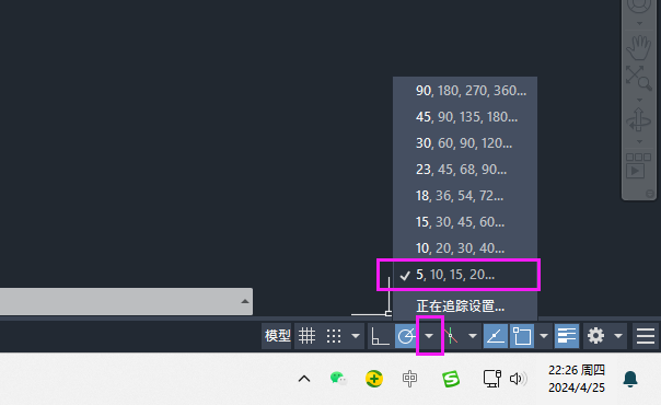 1、打开CAD2024软件,设置角度设置。选择5,10,15,20等。