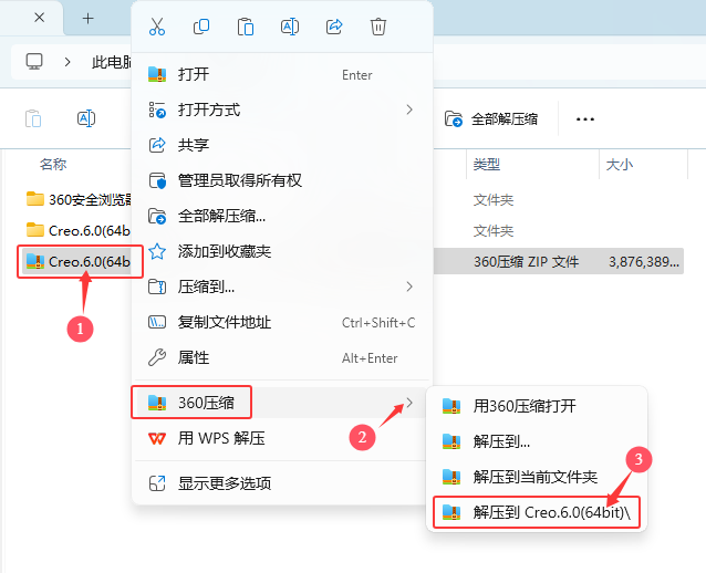 1、右击下载好的CREO6.0(64bit)安装包,点击360压缩,再点击解压到CREO6.0(64bit)选项。