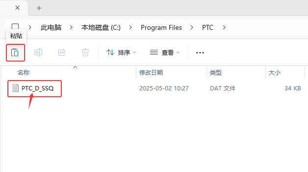 10、双击PTC文件夹进入,点击粘贴选项,把PTC_D_SSQ文件粘贴到此文件夹中。