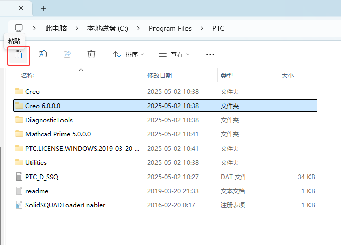 31、打开此电脑--本地磁盘C--Program Files--PTC文件夹,点击粘贴,把破解文夹复制过来。