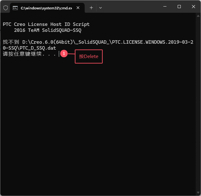 6、再双击打开FillLIcense文件,弹出命令后,按Delete键。