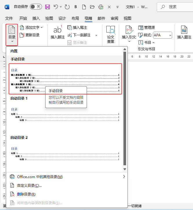 3、然后再点击目录里面的手动目录选项。